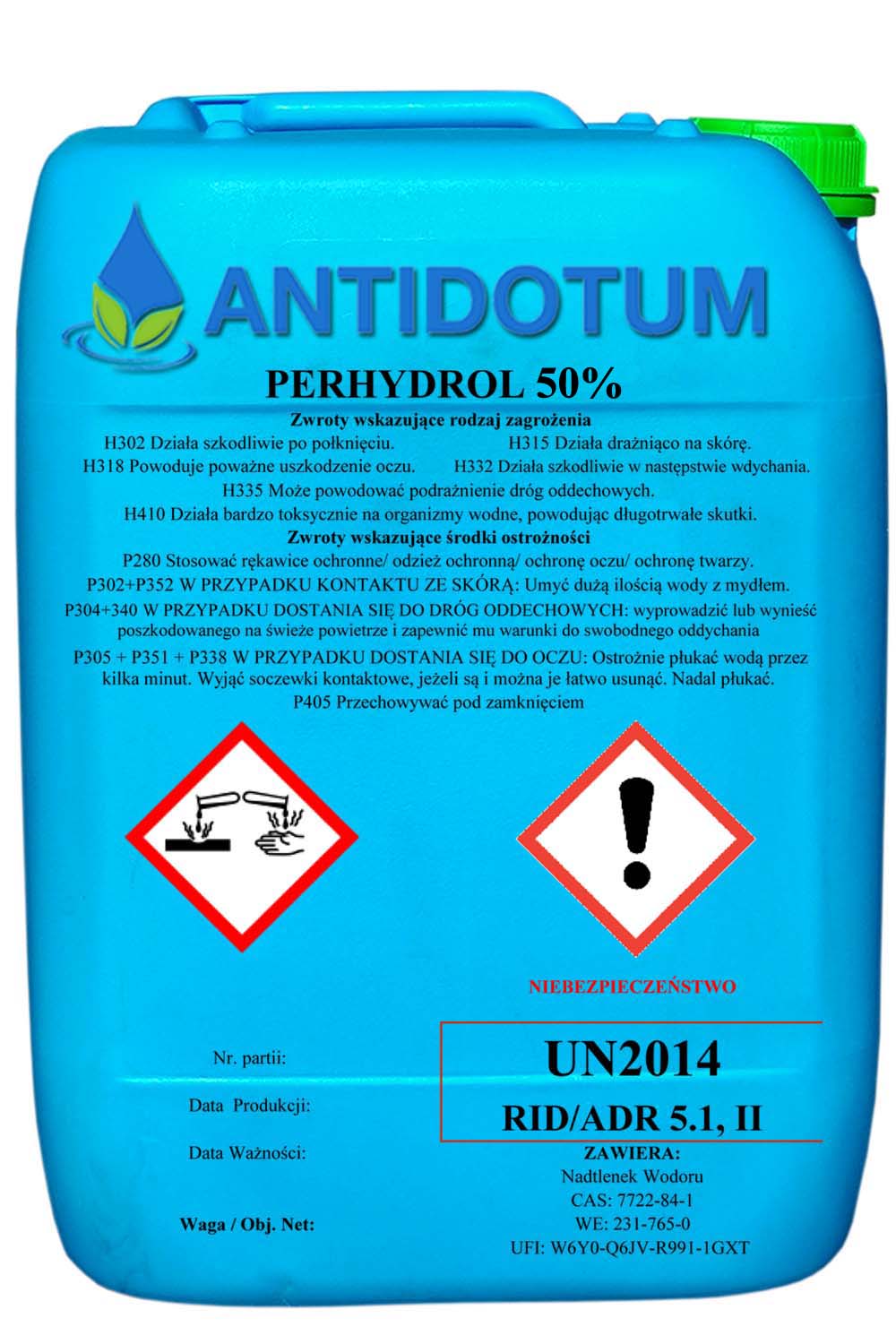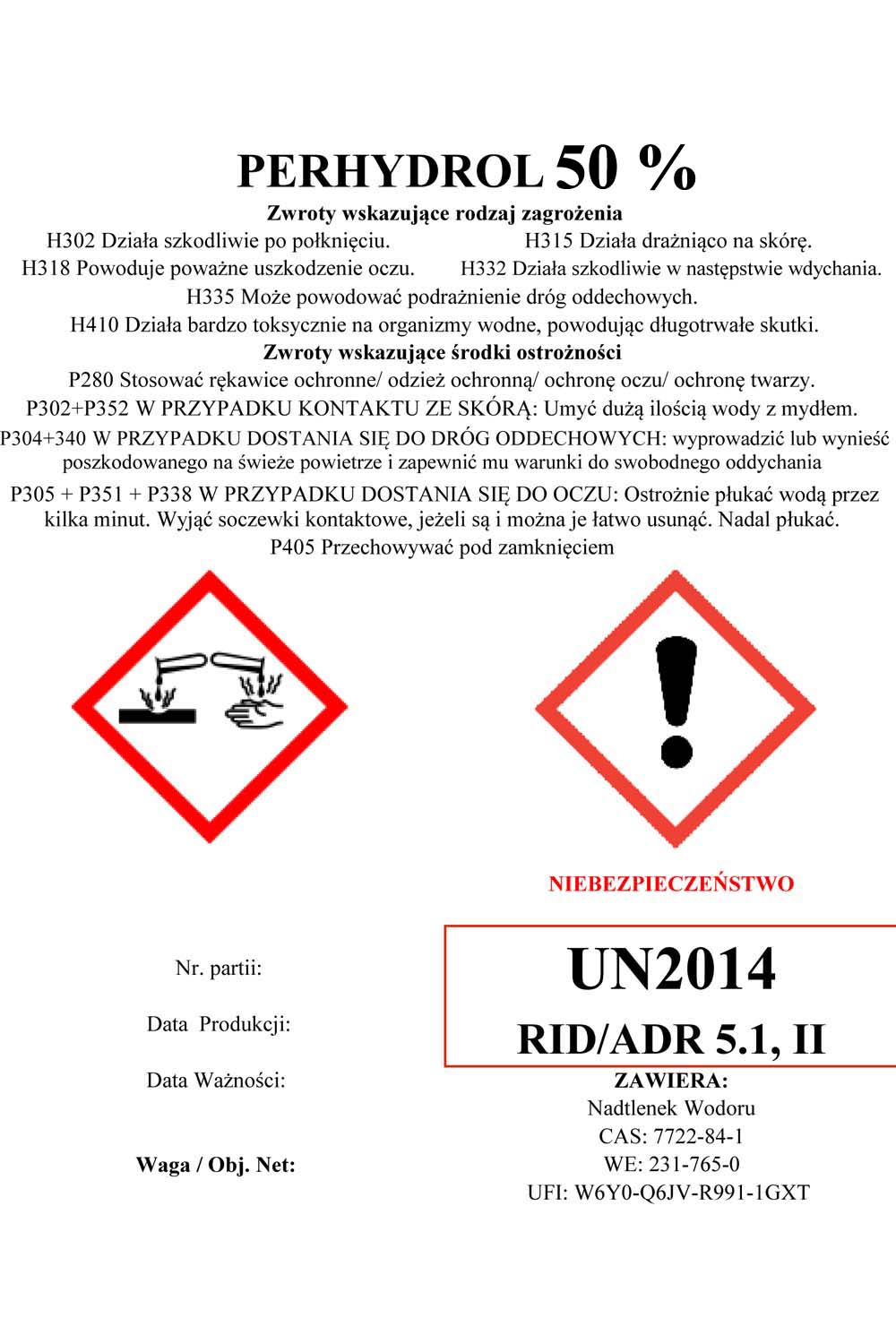 Strona główna » Surowce Chemiczne » Perhydrol 50% 25kg (UN2014, 5.1, II)